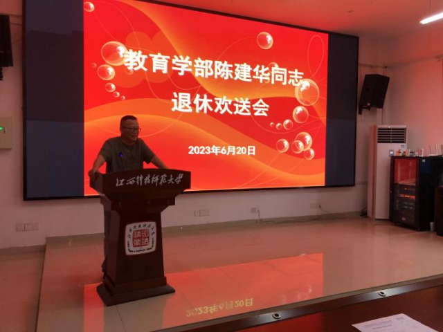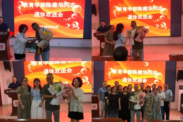 为表达对耕耘于教育岗位几十载的退休教师的感谢与敬意,进一步激励年轻一代传承教师前辈们的育人、担当和奉献精神,2023年6月20日下午,江西科技师范大学教育学部在红角洲校区文科楼W1319为退休职工陈建华同志举办了一场简洁而又温馨的荣誉退休仪式。仪式由教育学部主任欧阳忠明主持,学部领导徐艳、闵学良、肖称萍、吴根洲、赵清良及全体教育学部教职工参加仪式。